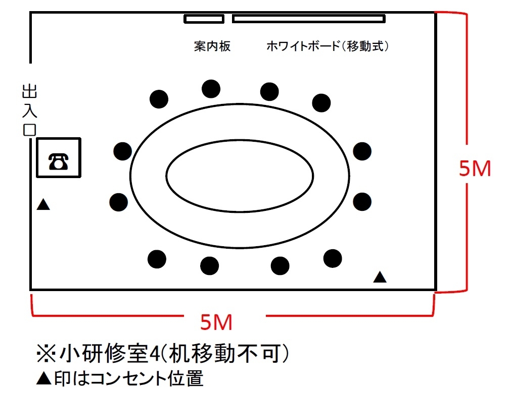 | 常設 | 机×6、椅子×12(予備3)、ホワイトボード×1 ※小研修室4のみ円卓机 |