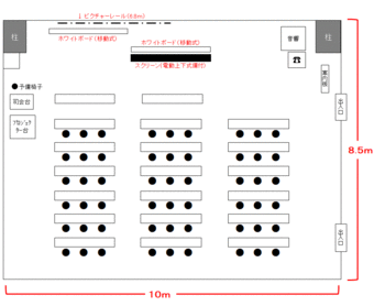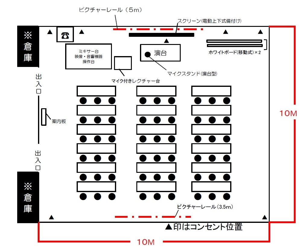 | 常設 | 机×33、椅子×99、移動式ホワイトボード×2、備付ホワイトボード×1、案内板×1、演台×1、花台×1、司会台×1、大型モニター×2 | ![]() ![]() |