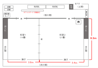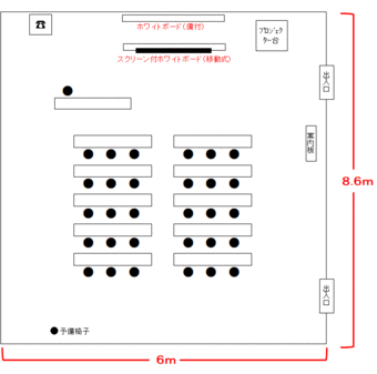 | 常設 | 机×18、椅子×54、ホワイトボード×2、案内板×1、演台×1、レクチャー台×1 | ![]() ![]() |