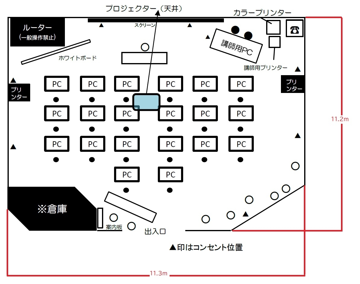 | 常設 | 机×11、椅子×32(予備3)、壁面ホワイトボード×1、スクリーン付ホワイトボード×1、案内板×1、プロジェクター台×1 |